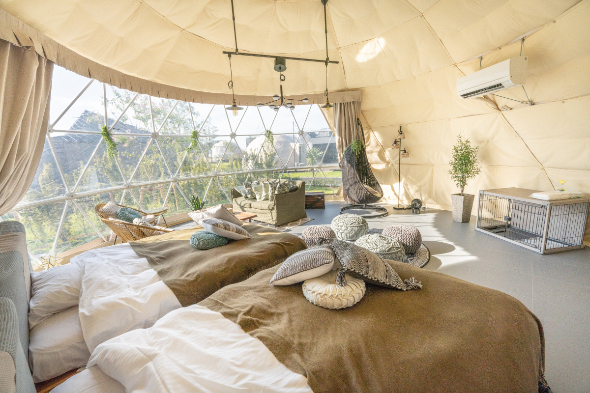 這裡的住宿分為「溫泉和泳池完備的私人別墅區」和「獨有的圓頂帳篷豪華露營區」,