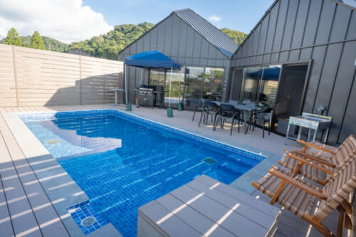 這個設施的魅力在於能一覽無遺大海風光的室外露台、私人泳池和天然溫泉。
