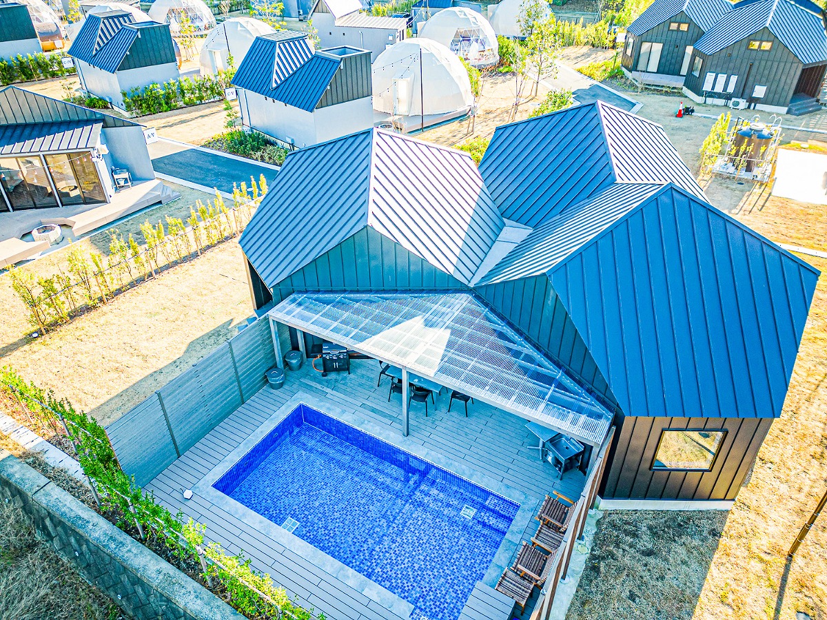 是一處佔地超過500㎡,設有客房溫泉、私人泳池和露營營火等的豪華露營度假村。