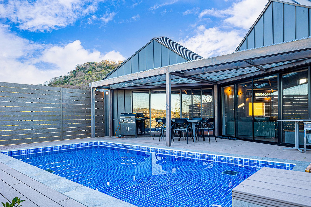 這個設施的魅力在於能一覽無遺大海風光的室外露台、私人泳池和天然溫泉。