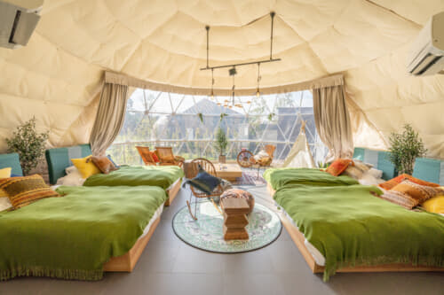 這裡的住宿分為「溫泉和泳池完備的私人別墅區」和「獨有的圓頂帳篷豪華露營區」,